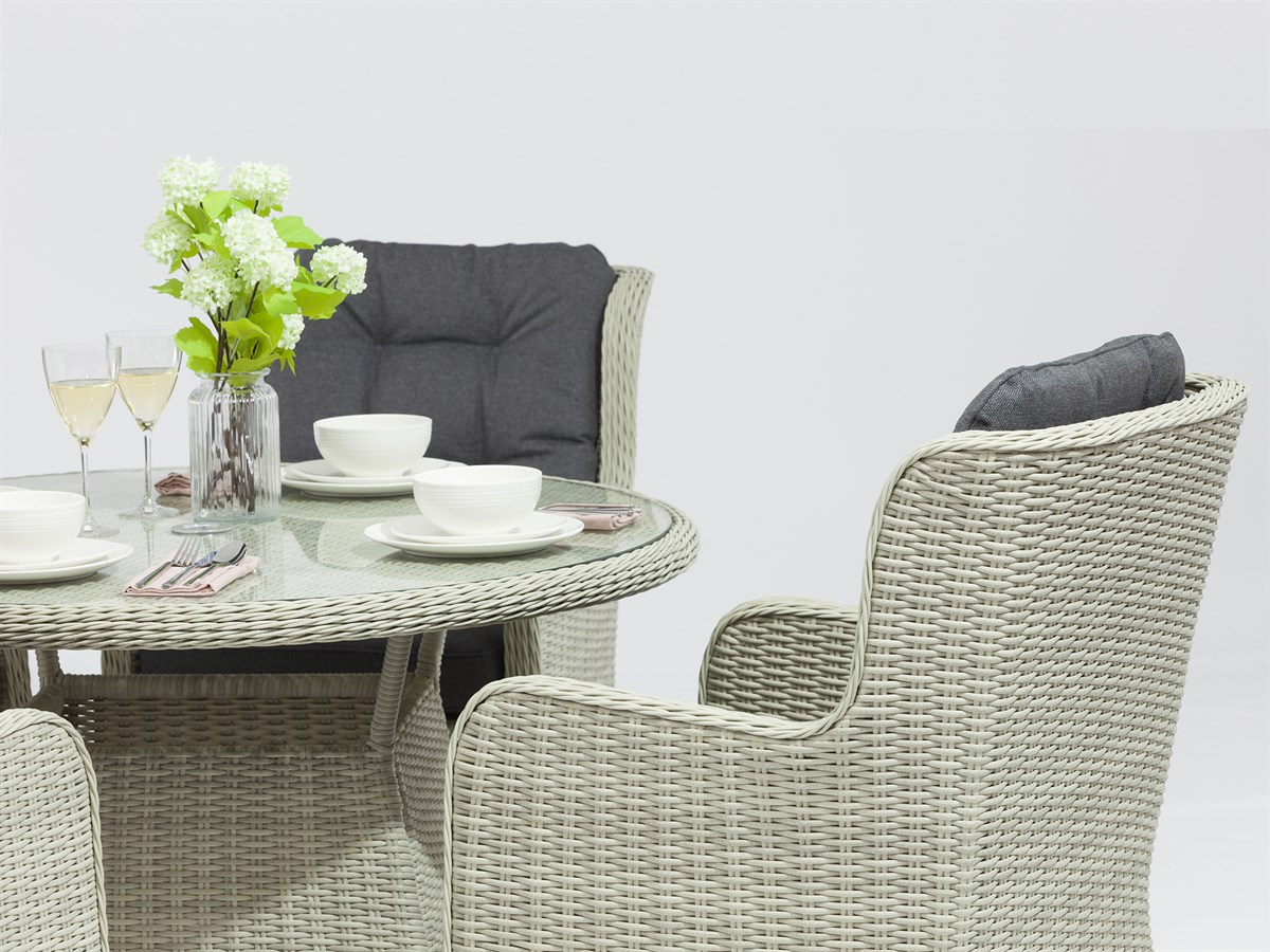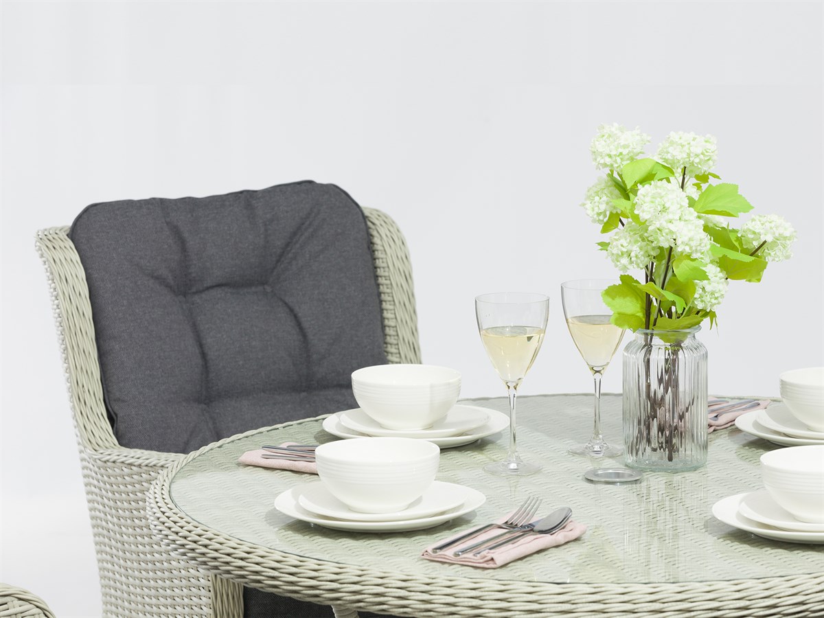 Made with a rust-free aluminium frame, the chairs are lightweight, durable and blissfully comfortable. The glass table top is recessed into the weave for added protection and aesthetics. The soft-touch, Herringbone Dusk cushions are made from our quality season-proof fabric which is water, stain and frost-resistant.