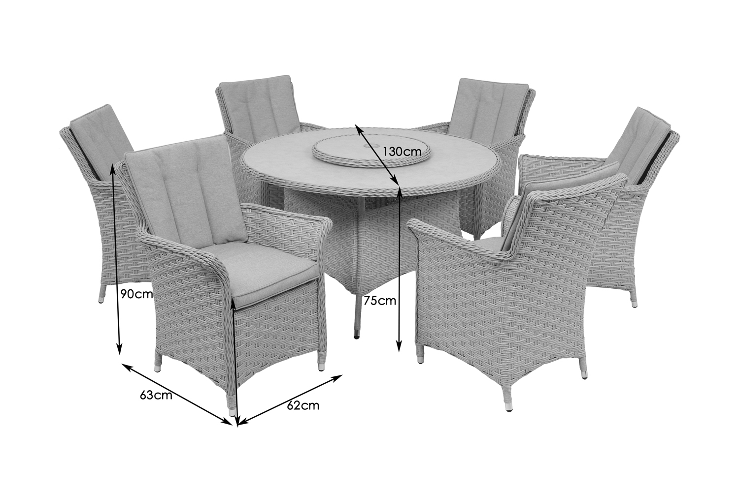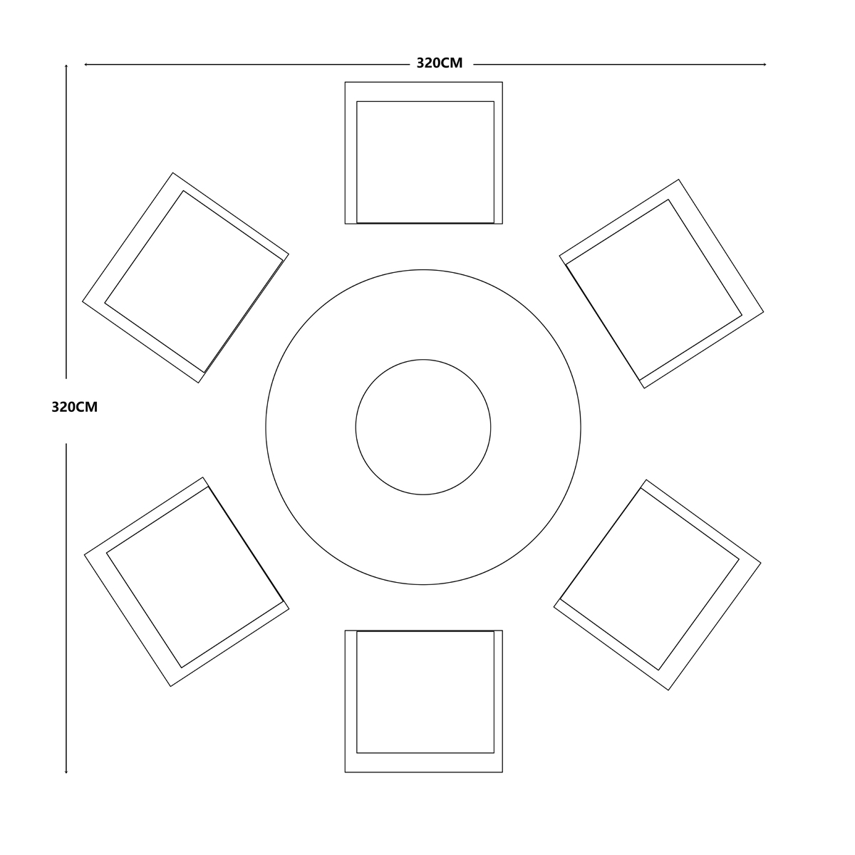 • Set includes: 1 x 130cm fixed height Round Table, 1 x 60cm Lazy Susan, 6 x Dining Chairs, 1 x 3m Emperor Parasol, 1 x 15kg Parasol Base
